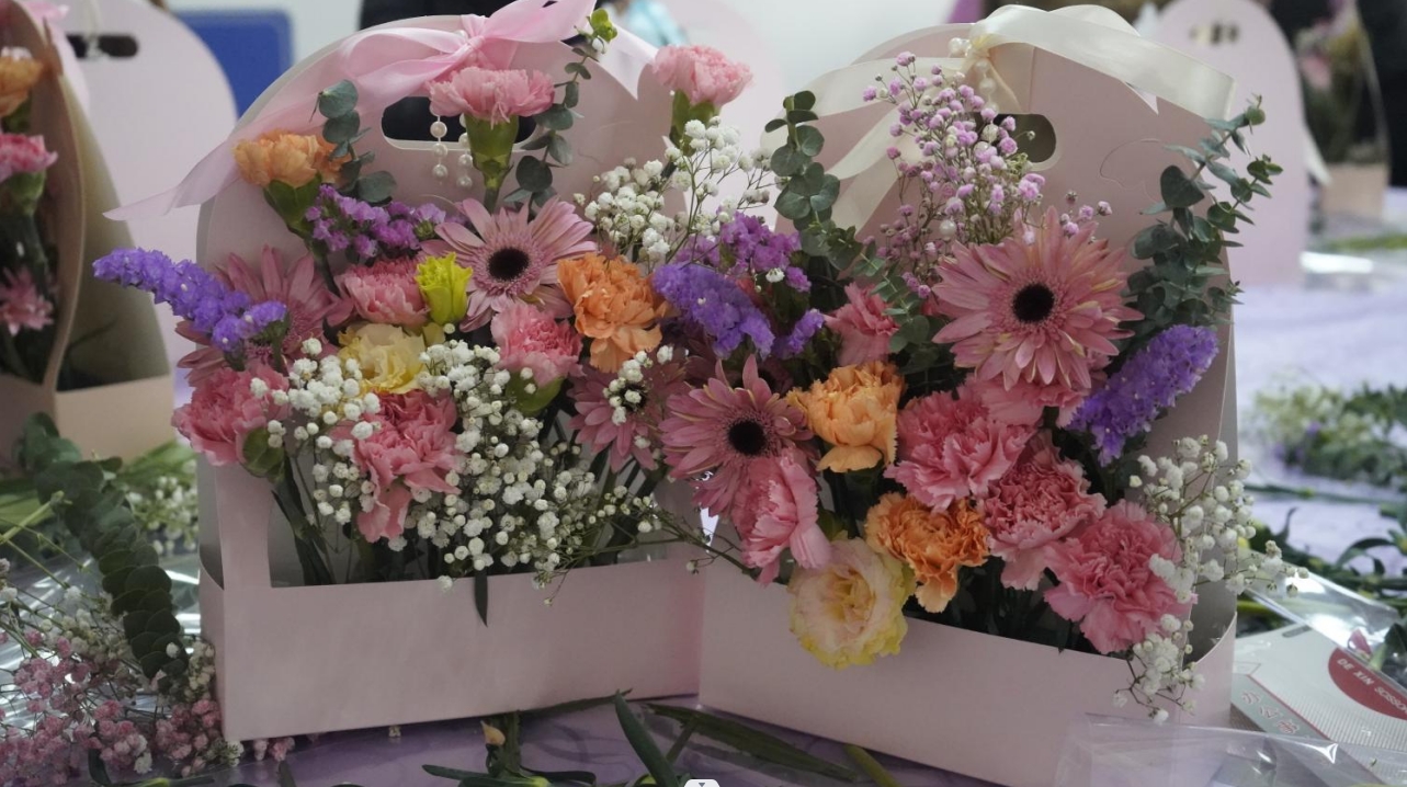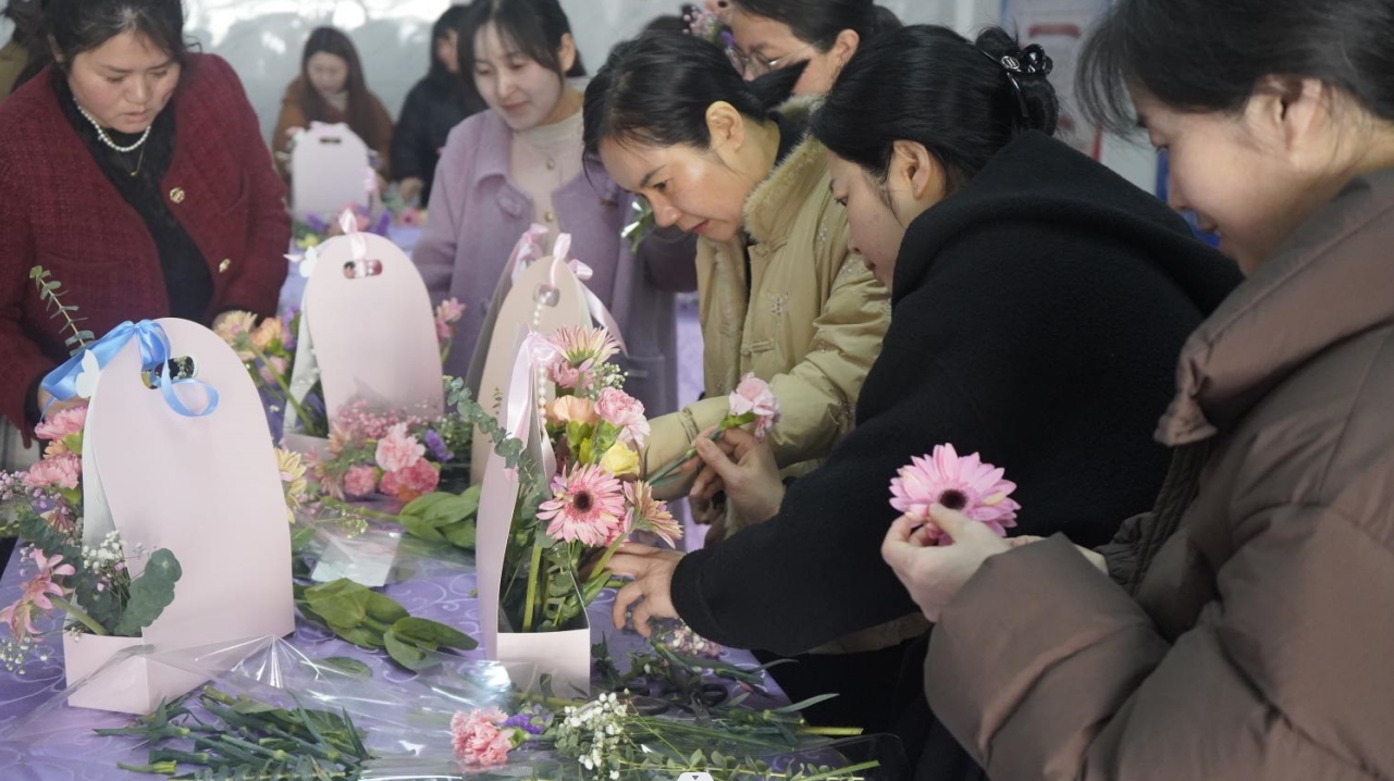 插花运动现场,,各人在花艺先生的指导下充分验展想象力和创立力,,用自己灵巧的双手修剪枝叶、搭配色彩、设计造型,,让一束束寄托优美愿望的插花作品展现在各人眼前。。。。。